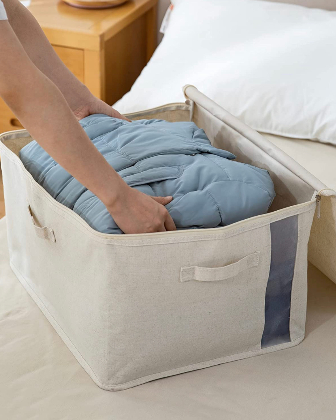 Storage bins like these recyclable variety by Shimoyama on Amazon are perfect for compressing large items, like blankets, and keeping them neatly stowed away until they are needed. Add some vanilla soy wax melts, or cedar sachets, it’ll keep everything smelling fresh.